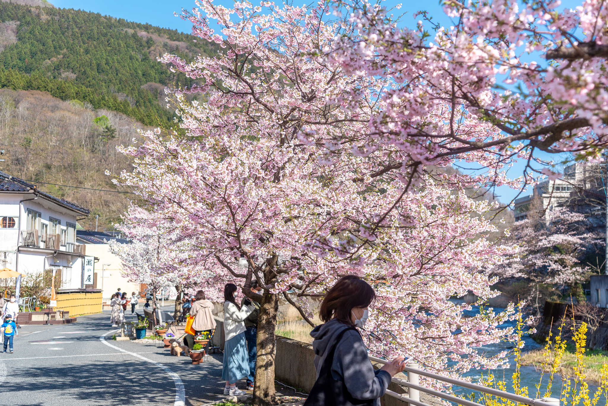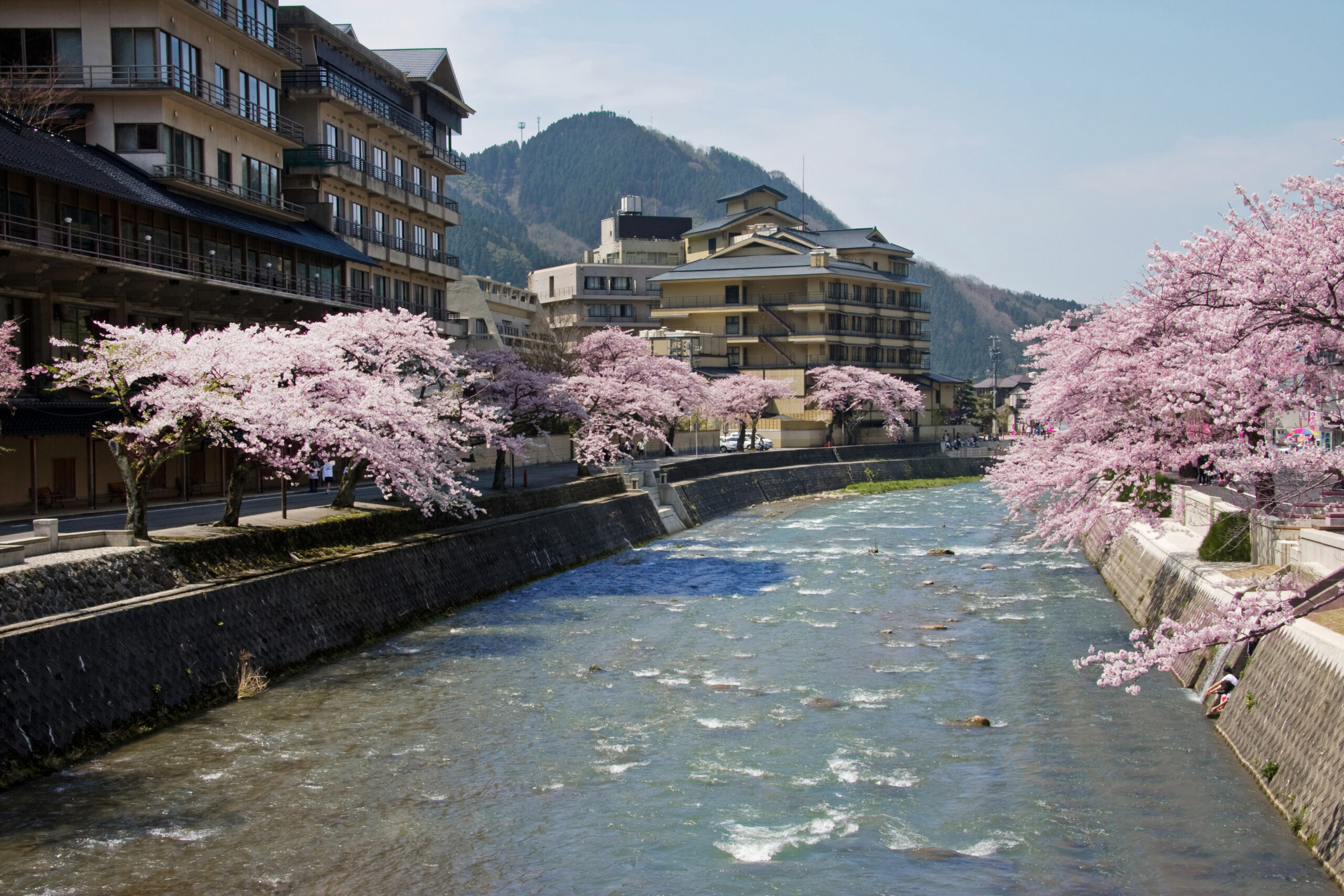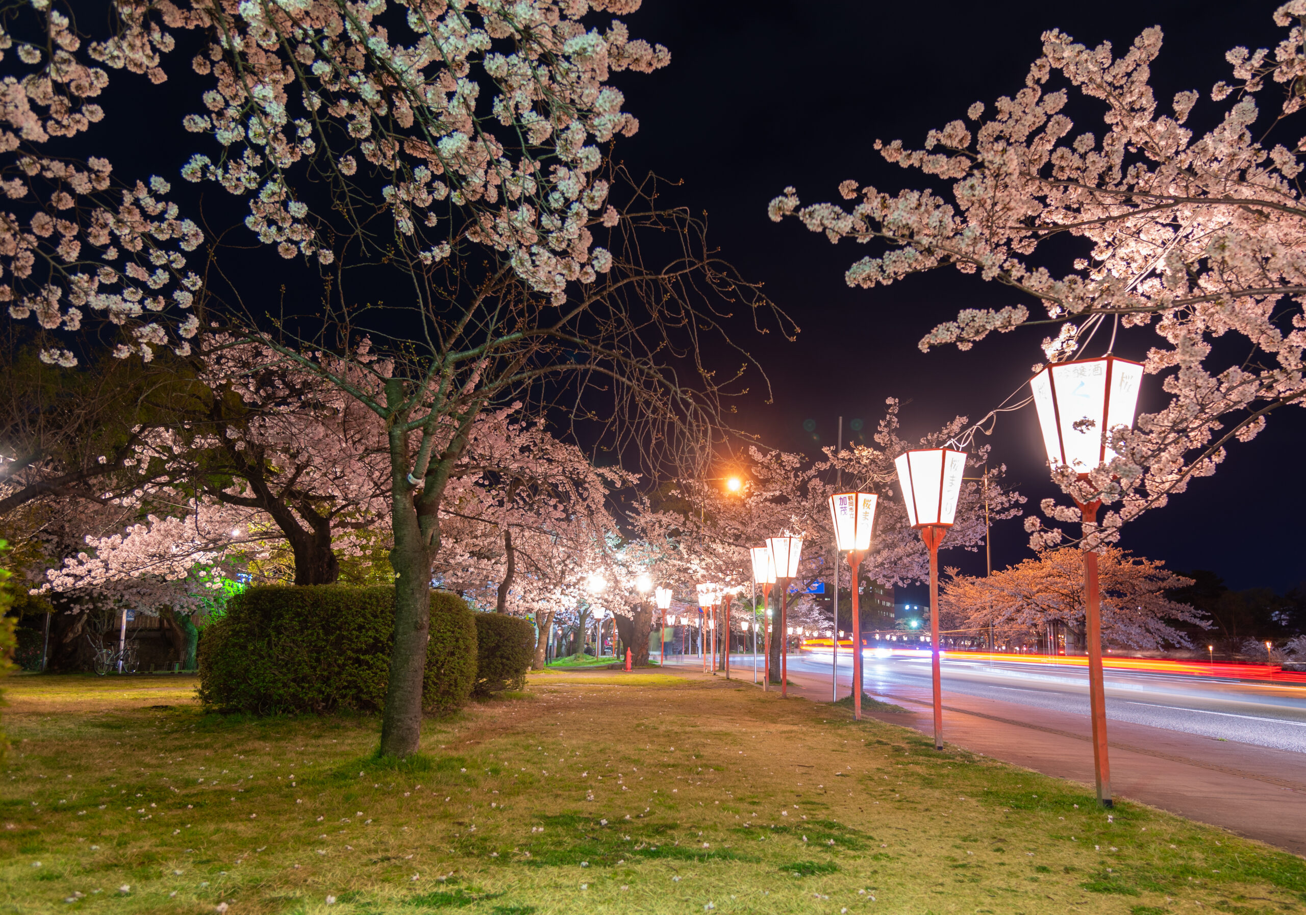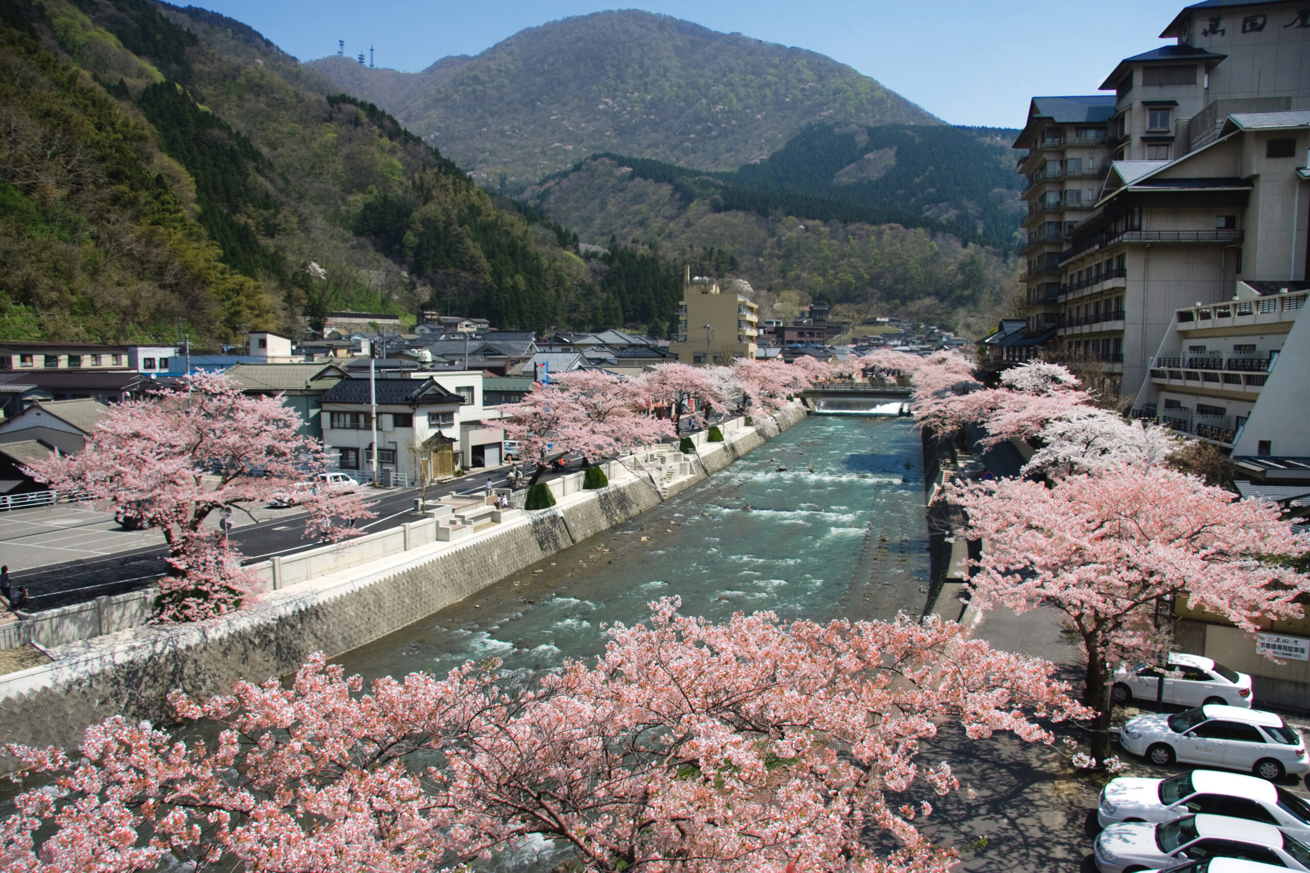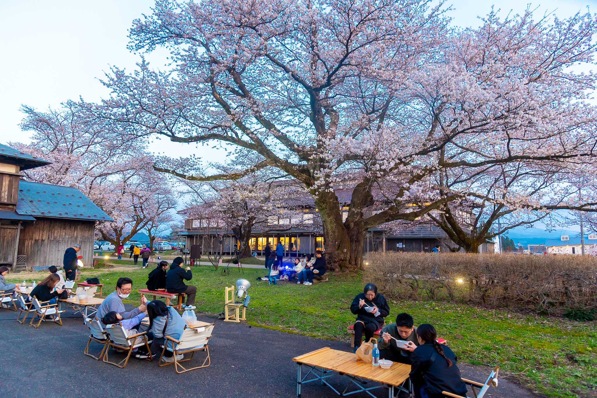 At Atsumi Onsen, the cherry trees lining the Atsumi River are beautifully illuminated each evening, creating a magical nighttime atmosphere until 11:00 PM.