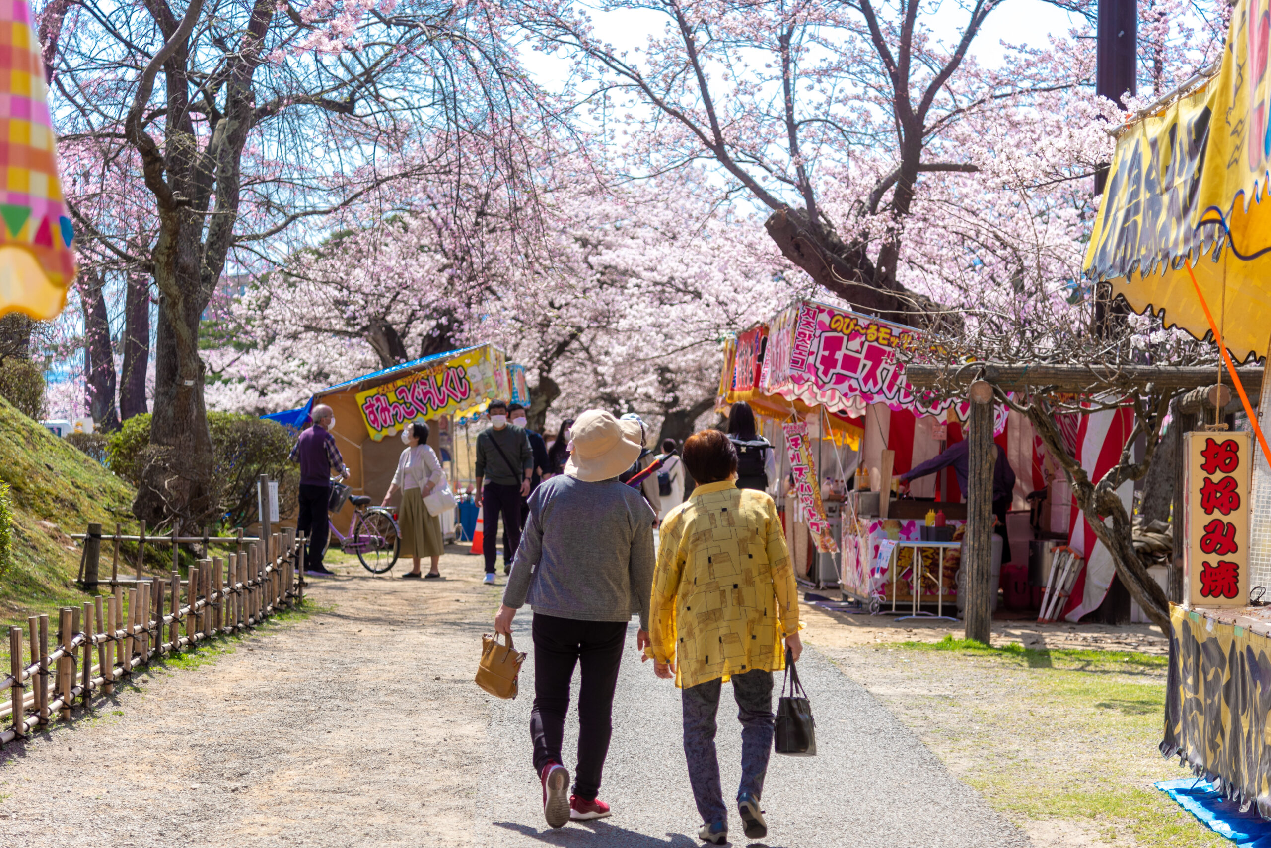 From the first cherry blossom announcement to the end of the sakura season, Tsuruoka Park hosts the annual Tsuruoka Sakura Festival. During this time, visitors can enjoy a lively atmosphere with numerous yatai—food stalls and game booths—set among the 730 cherry trees surrounding Shonai Shrine.