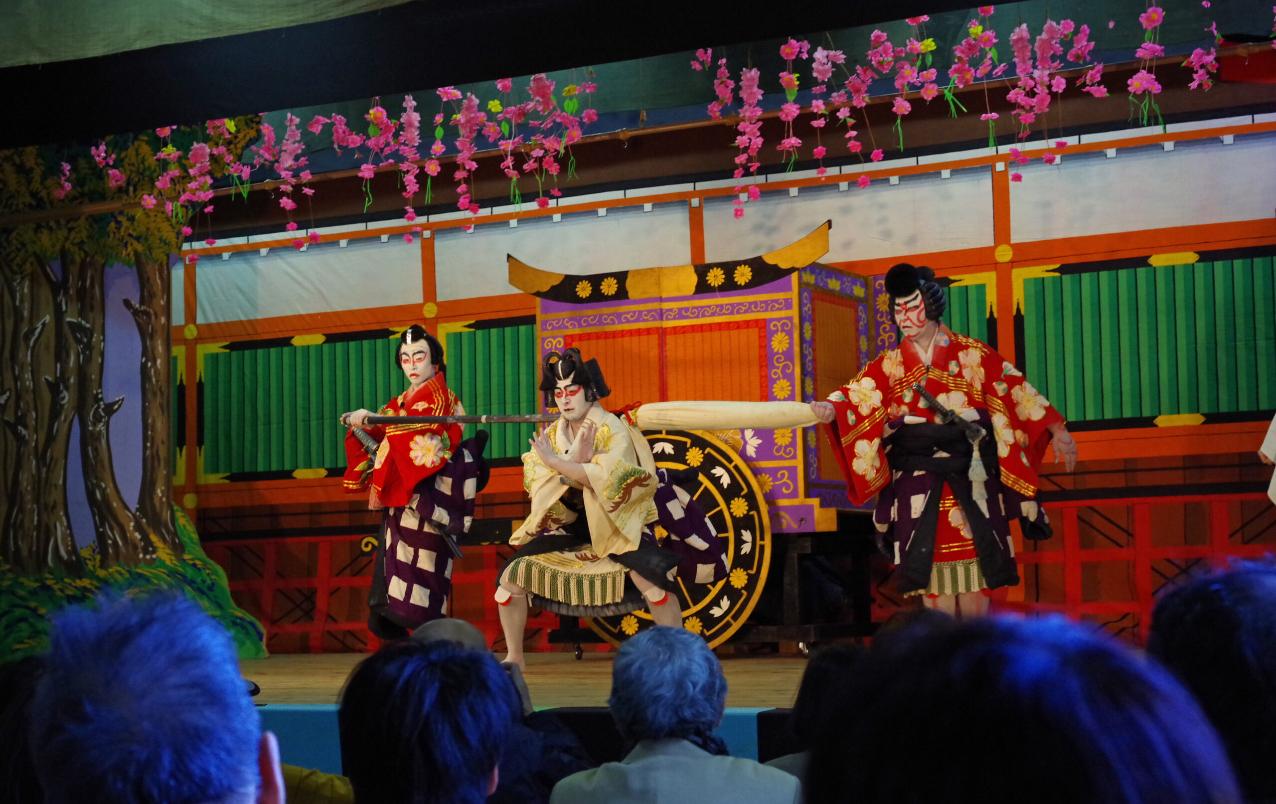 While Noh is very solemn, during the kabuki performance, local people drink, eat and laugh together, making this a very joyful event.